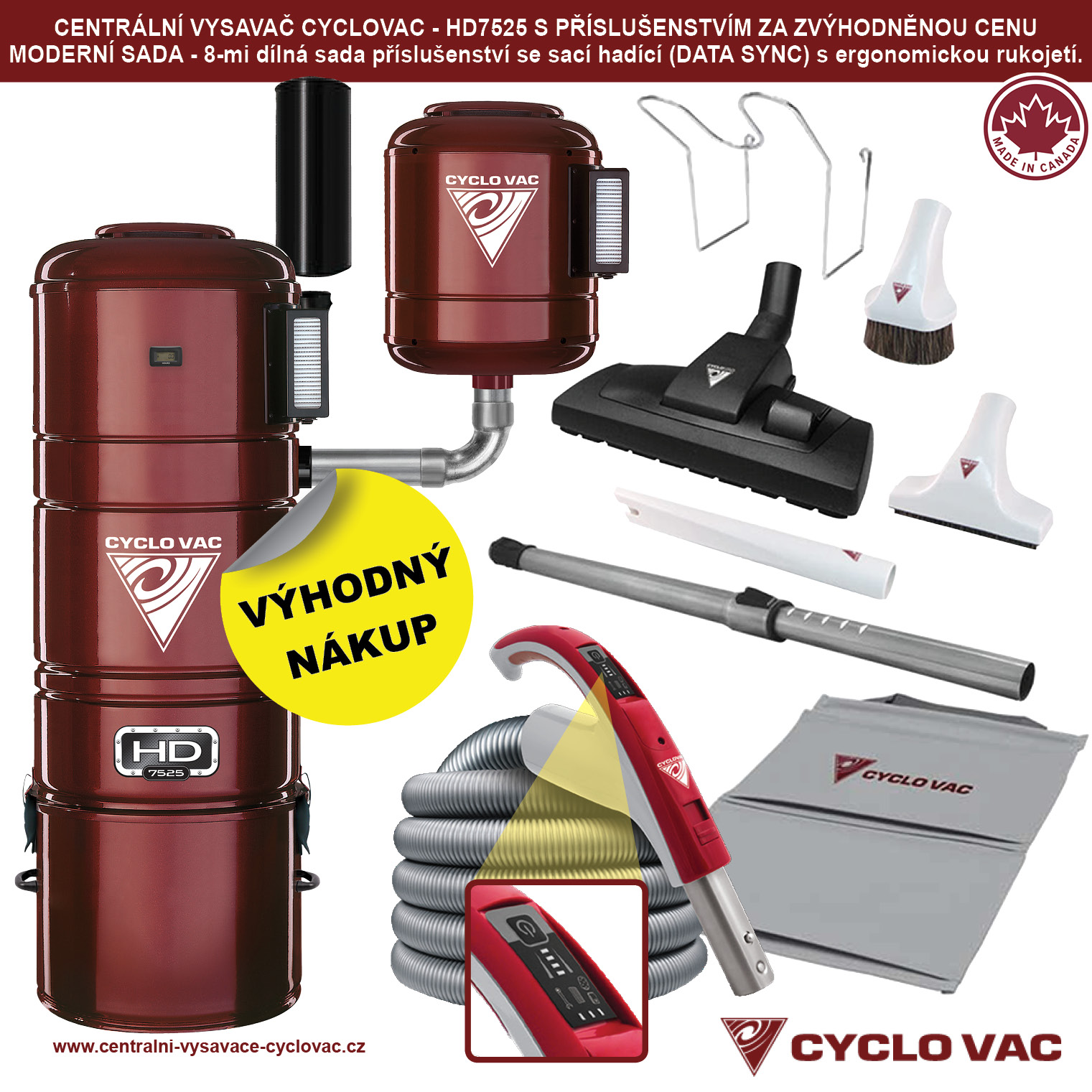 Centrální vysavač Cyclovac HD7525 1254 AW je nejvýkonnější Centrální vysavač značky Cyclovac s příkonem 3380 W. Tento model Centrálního vysavače Cyclovac má dvě jednotky, hlavní a vedlejší. Vedlejší jednotka je buď zapojena paralelně, nebo sériově a přidává té hlavní ještě více výkonu. Dále Centrální vysavač Cyclovac HD7525 má technologii Data sync, Hybridní filtrační systém a CyclofiltreTM, jenž zabraňuje růstu plísní, bakterií a hub, které mohou být spojeny s alergiemi.
