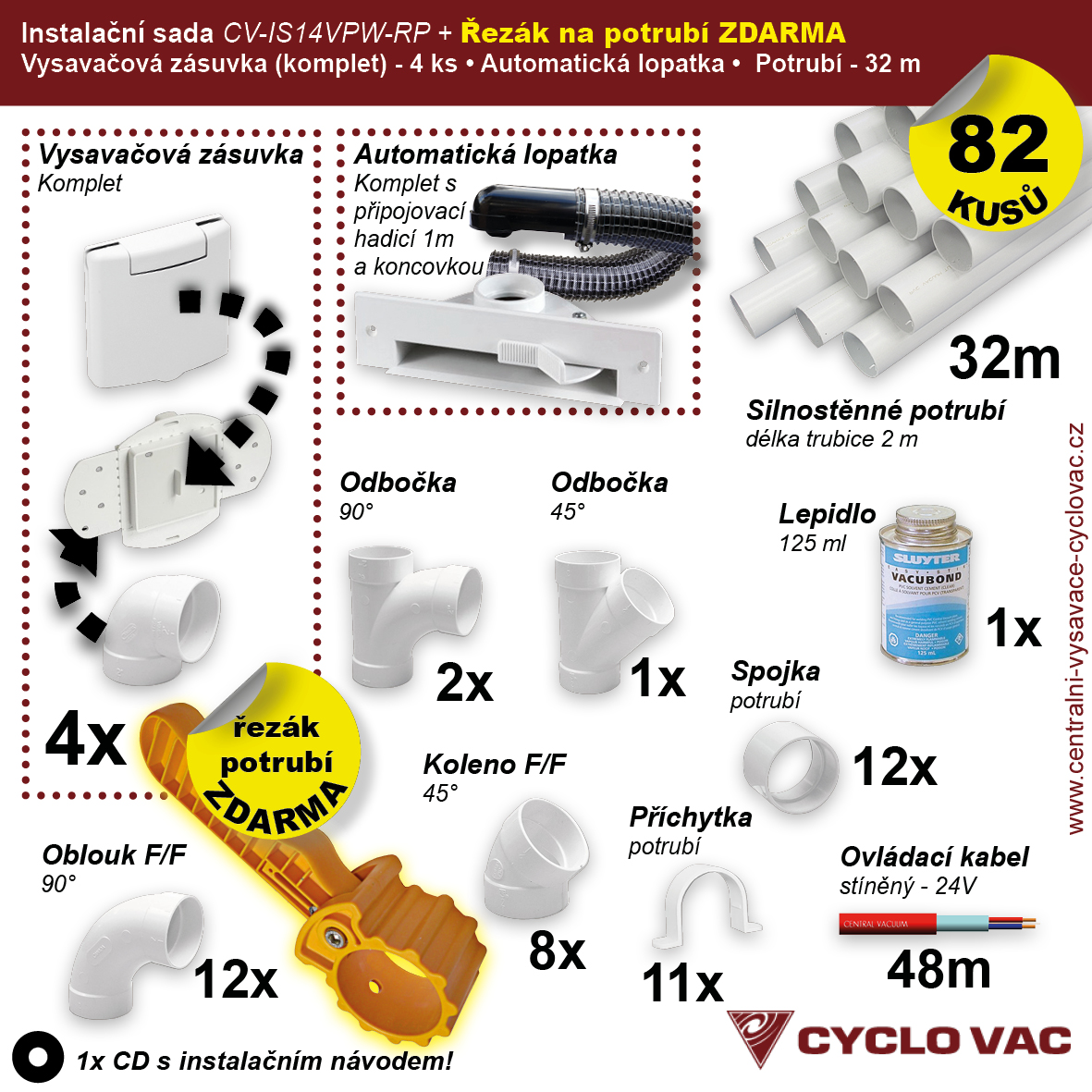 Cenově zvýhodněná instalační sada potrubních rozvodů centrálního vysávání obsahuje: