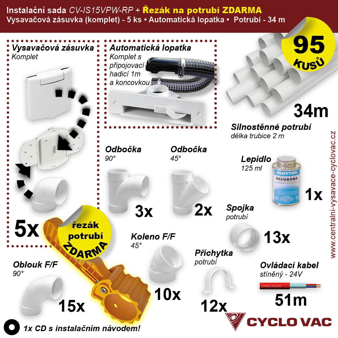 Cenově zvýhodněná instalační sada potrubních rozvodů centrálního vysávání obsahuje: