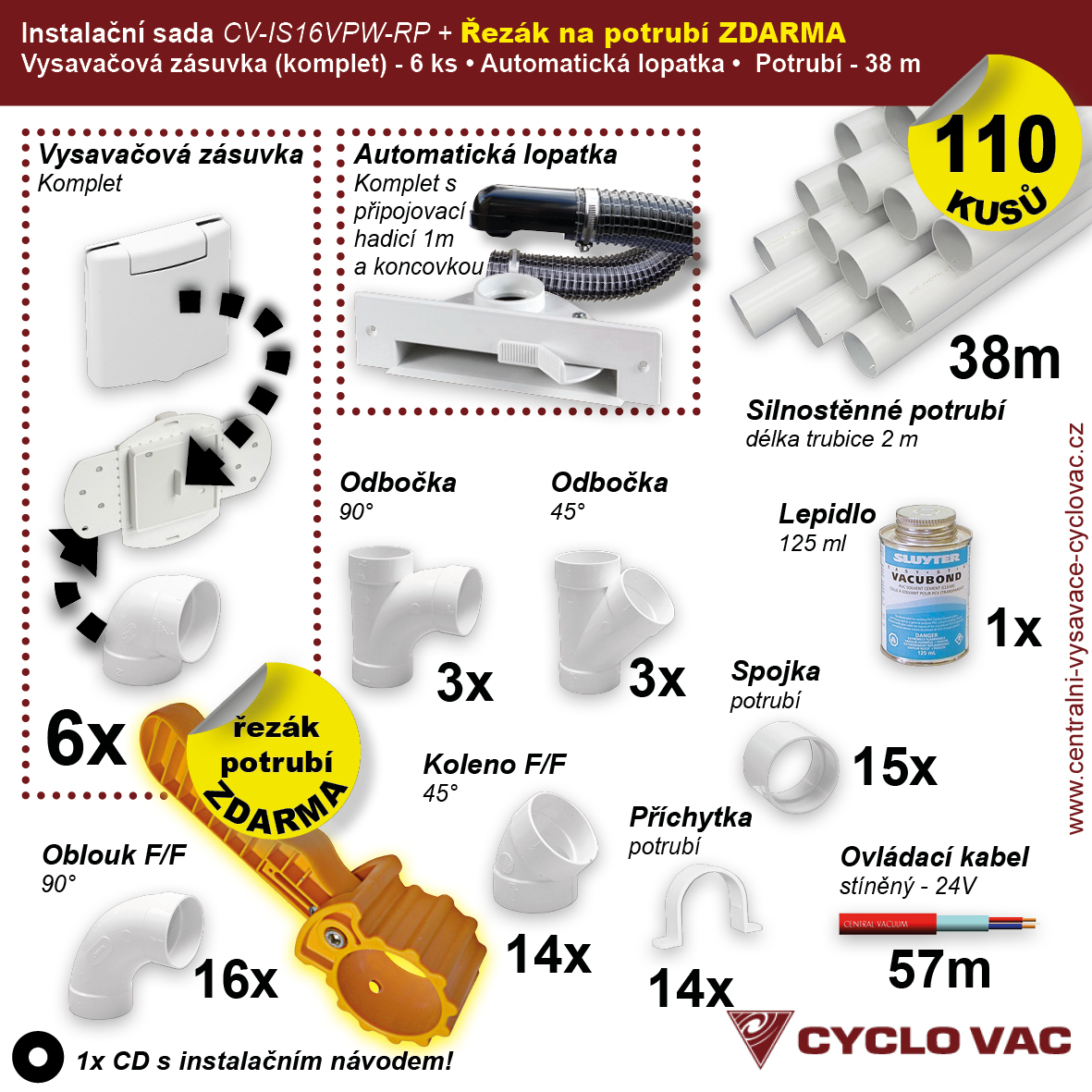 Cenově zvýhodněná instalační sada potrubních rozvodů centrálního vysávání obsahuje: